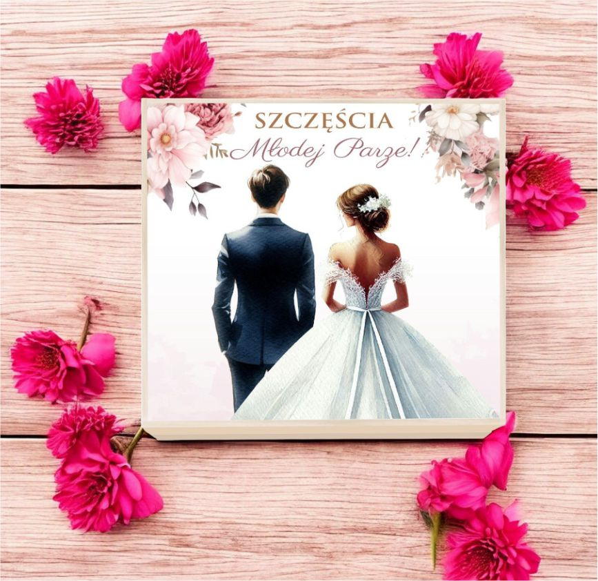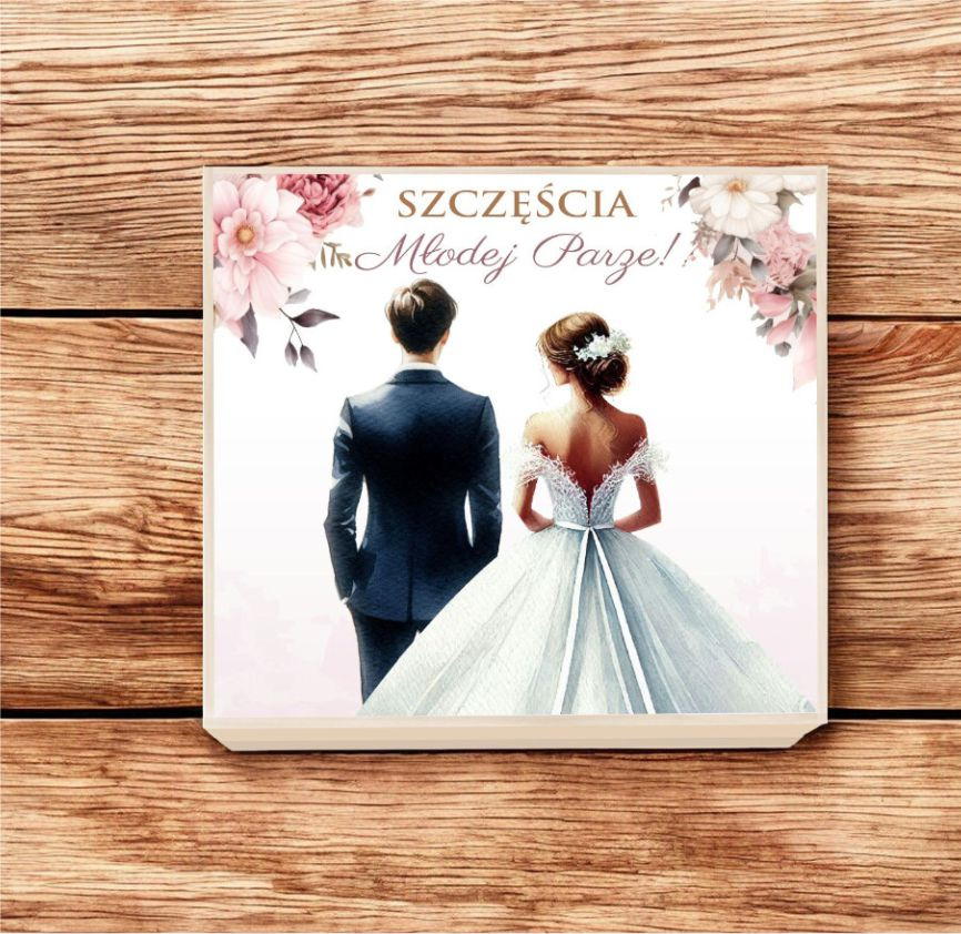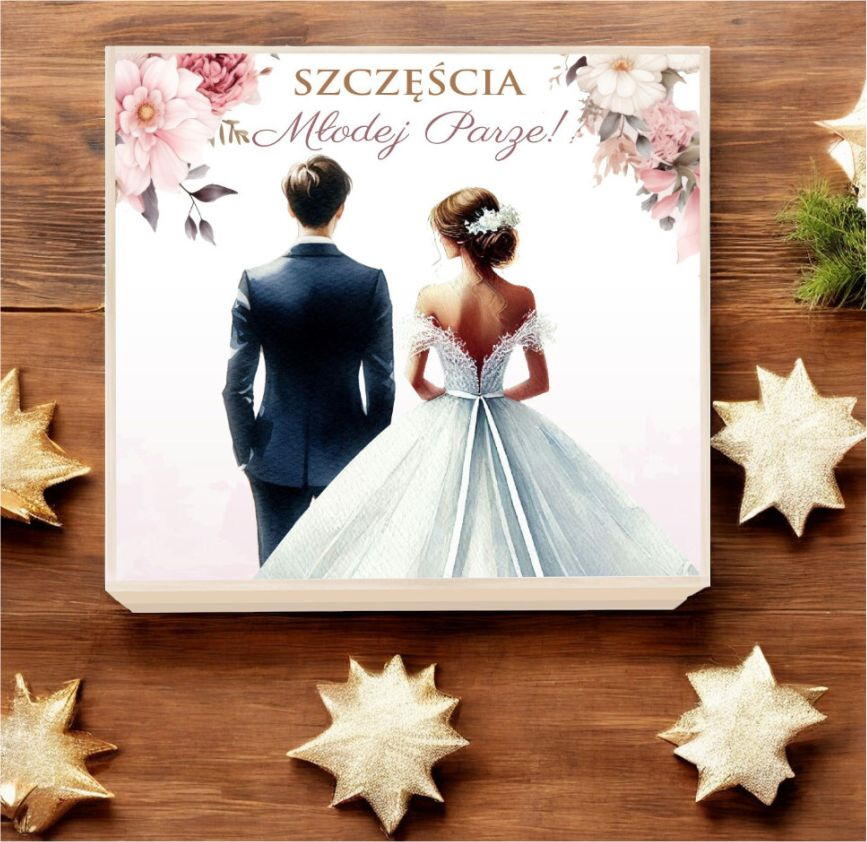 Na zewnątrz pudełka znajduje się naklejka z napisem "Szczęścia Młodej Parze!".