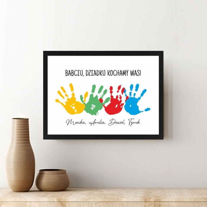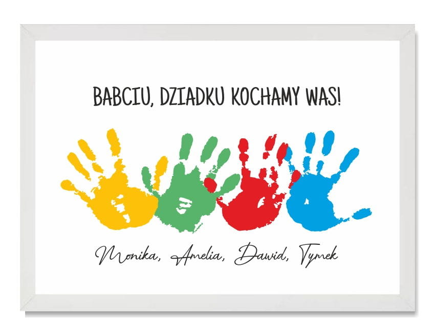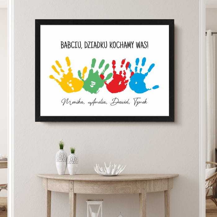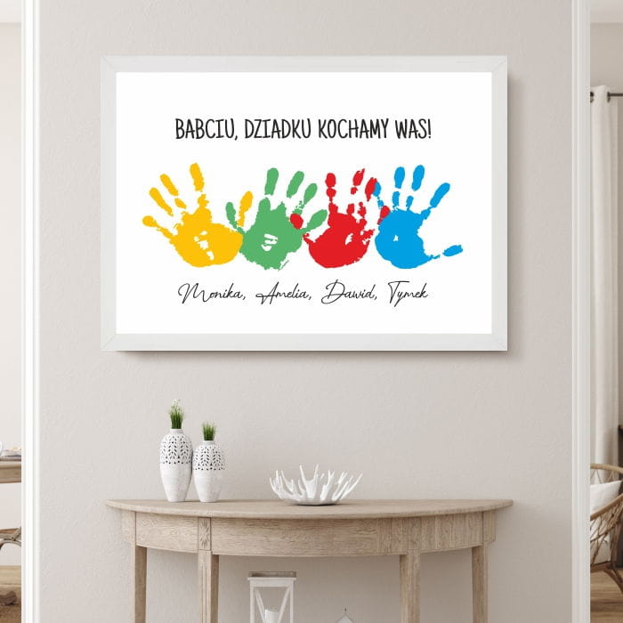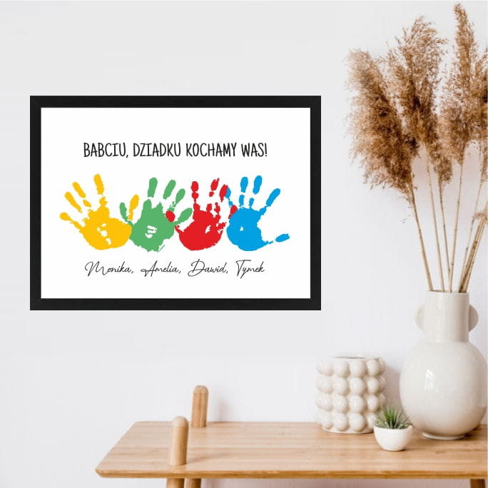 Piękna ramka plakatowa z odciskami dłoni w białej lub czarnej ramce z dedykacją od wszystkich wnuków - na plakacie możesz umieścić imiona wnuków.