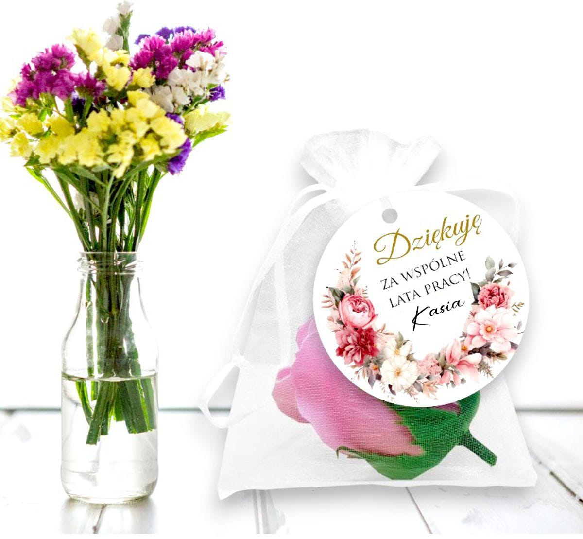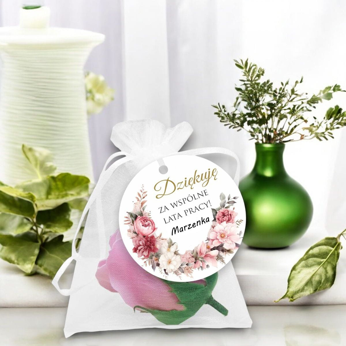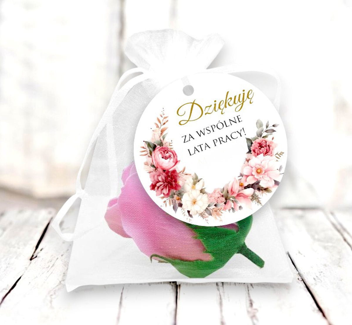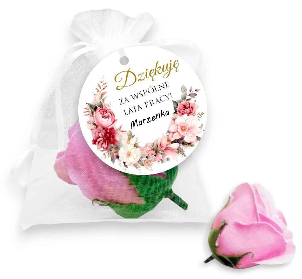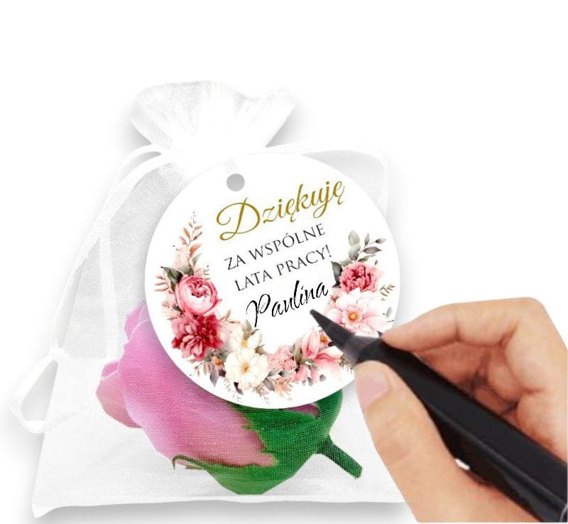 Szukasz wyjątkowego prezentu z okazji przejścia na emeryturę? Mydlana róża w eleganckim woreczku z organzy to idealny prezent na pożegnanie koleżanek z pracy. Ten delikatny i subtelny podarunek zachwyci wyglądem, a jego zapach wprowadzi chwilę relaksu. Mydlana róża jest dodatkowo ozdobiona papierową zawieszką, do której można dodać swoje imię, dodając charakterystyczny akcent.