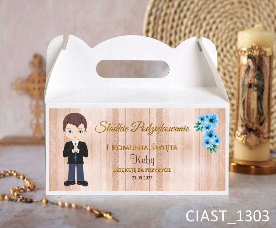 Pudełka na ciasto na I Komunię Świętą, chłopczyk z ciemnymi włosami na pudełku.