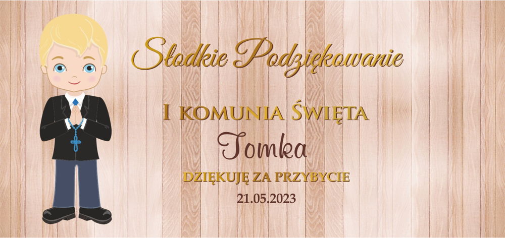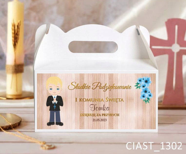 Pudełka na ciasto na I Komunię Świętą, chłopczyk z jasnymi włosami na pudełku
