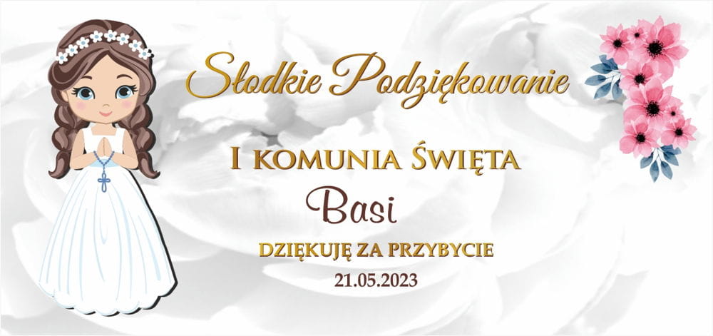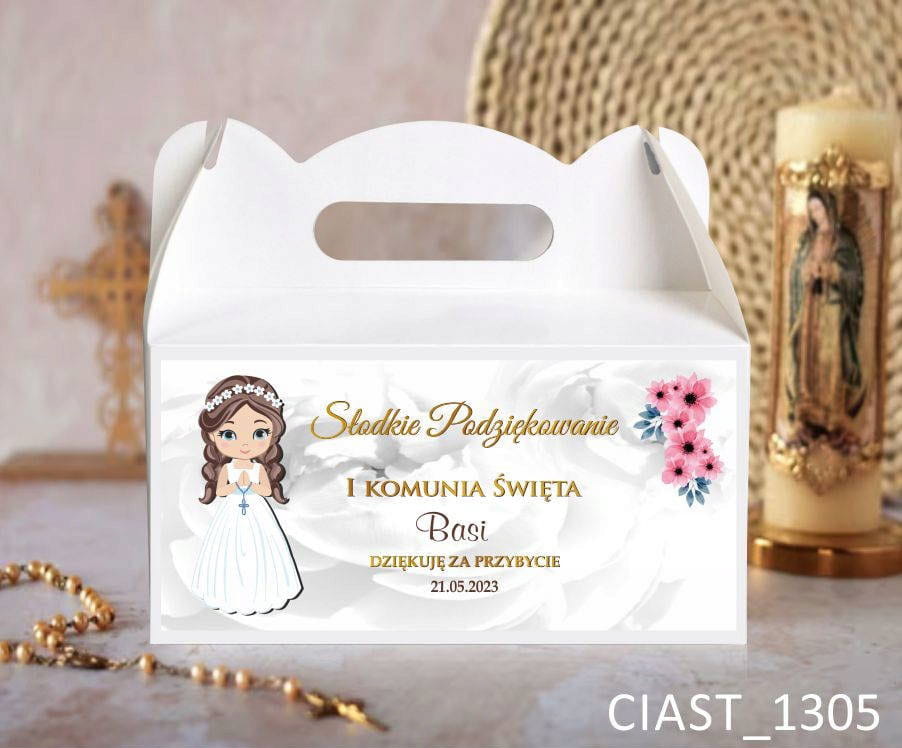 Pudełka na ciasto na I Komunię Świętą, podziękowanie od dziewczynki komunijnej z ciemnymi włosami