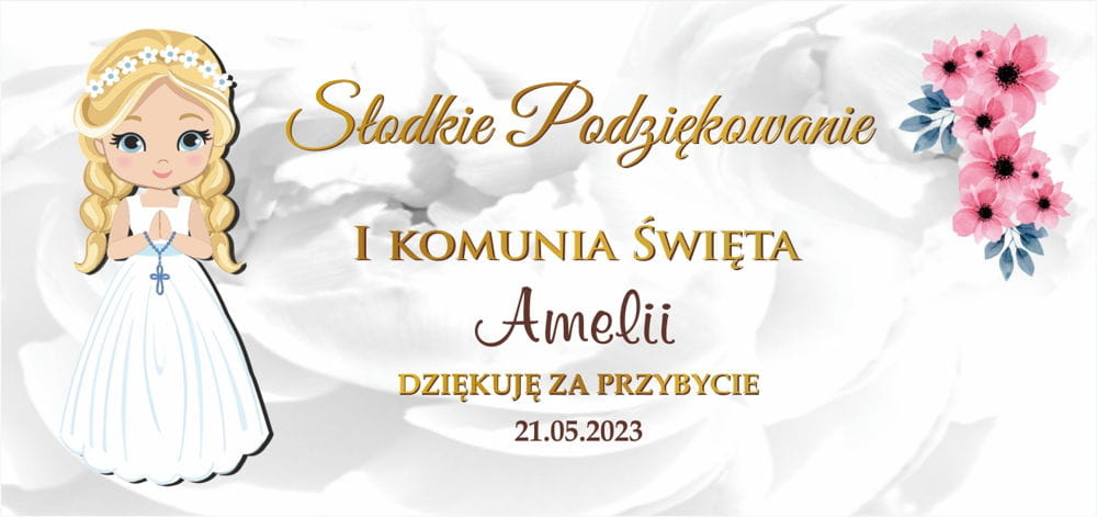 Naklejki na ciasto komunijne to uroczy dodatek, który podkreśli wyjątkowy charakter tego dnia. Znajdziesz wśród nich różnorodne motywy związane z Pierwszą Komunią Świętą, takie jak hostie, kielichy, oraz wizerunki dzieci komunijnych. Naklejki na ciasto komunijne są w pełni personalizowane.