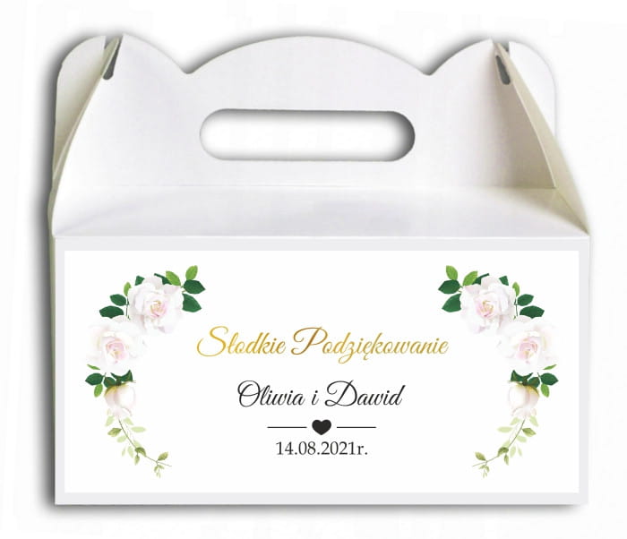 Pudełko na ciasto, Podziękowania dla gości, Białe róże, kwiaty, złota ramka