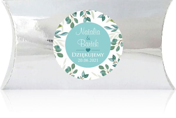 Pudełko "Poduszka" z personalizowaną naklejką, podziękowanie dla gości od Państwa Młodych, Pudełko z naklejką, turkusowa naklejka, zielone liście, podziękowanie.