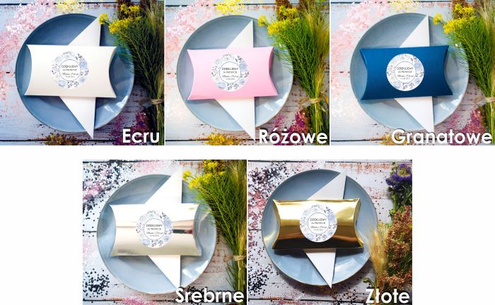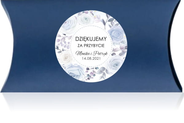 Pudełko "Poduszka" z personalizowaną naklejką, podziękowanie dla gości od Państwa Młodych, Pudełko z naklejką , pastelowe niebieskie kwiaty, róże .