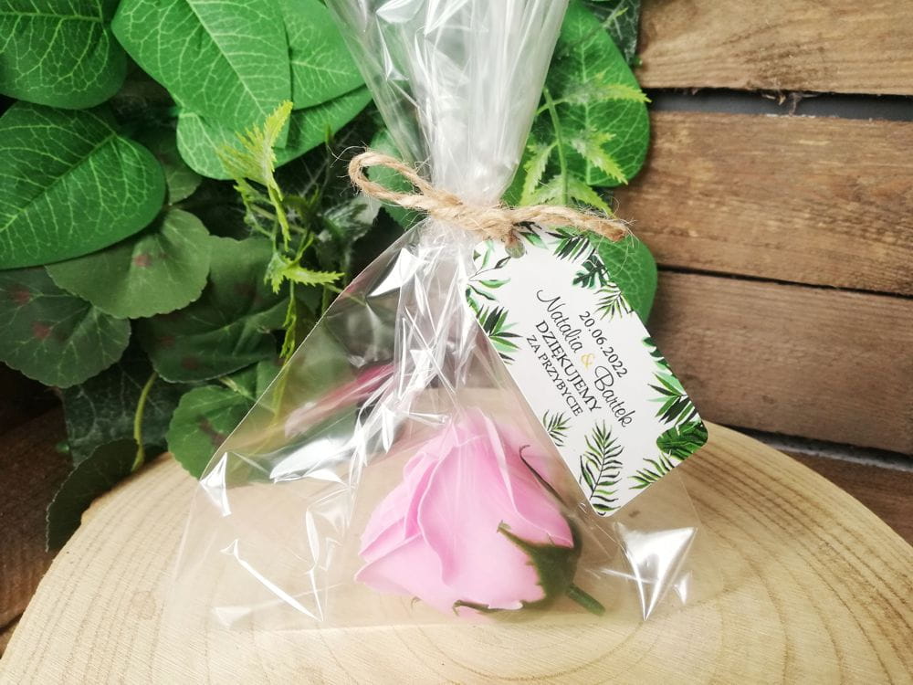 Nasze róże mydlane to oryginalny prezent, upominek dla gości weselnych. Oprócz róży mydlanej w zestawie znajduje się personalizowana zawieszka oraz woreczek celofanowy wraz z dołączonym sznureczkiem jutowym do samodzielnego zawiązania.