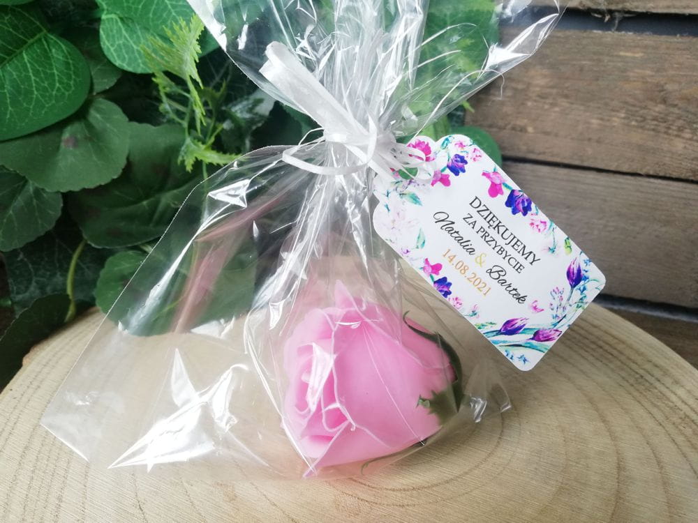 Nasze róże mydlane to oryginalny prezent, upominek dla gości weselnych. Oprócz róży mydlanej w zestawie znajduje się personalizowana zawieszka oraz woreczek celofanowy wraz z dołączonym sznureczkiem jutowym do samodzielnego zawiązania.