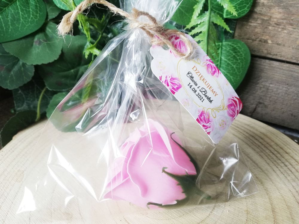 Nasze róże mydlane to oryginalny prezent, upominek dla gości weselnych. Oprócz róży mydlanej w zestawie znajduje się personalizowana zawieszka oraz woreczek celofanowy wraz z dołączonym sznureczkiem jutowym do samodzielnego zawiązania.