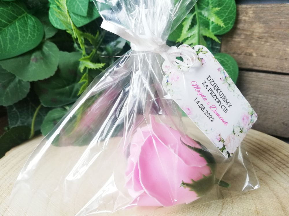 Nasze róże mydlane to oryginalny prezent, upominek dla gości weselnych. Oprócz róży mydlanej w zestawie znajduje się personalizowana zawieszka oraz woreczek celofanowy wraz z dołączonym sznureczkiem jutowym do samodzielnego zawiązania.