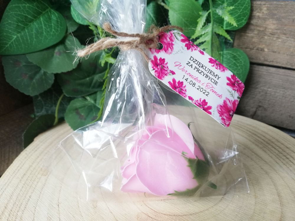 Nasze róże mydlane to oryginalny prezent, upominek dla gości weselnych. Oprócz róży mydlanej w zestawie znajduje się personalizowana zawieszka oraz woreczek celofanowy wraz z dołączonym sznureczkiem jutowym do samodzielnego zawiązania.