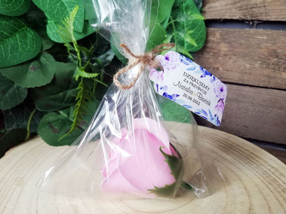 Nasze róże mydlane to oryginalny prezent, upominek dla gości weselnych. Oprócz róży mydlanej w zestawie znajduje się personalizowana zawieszka oraz woreczek celofanowy wraz z dołączonym sznureczkiem jutowym do samodzielnego zawiązania.