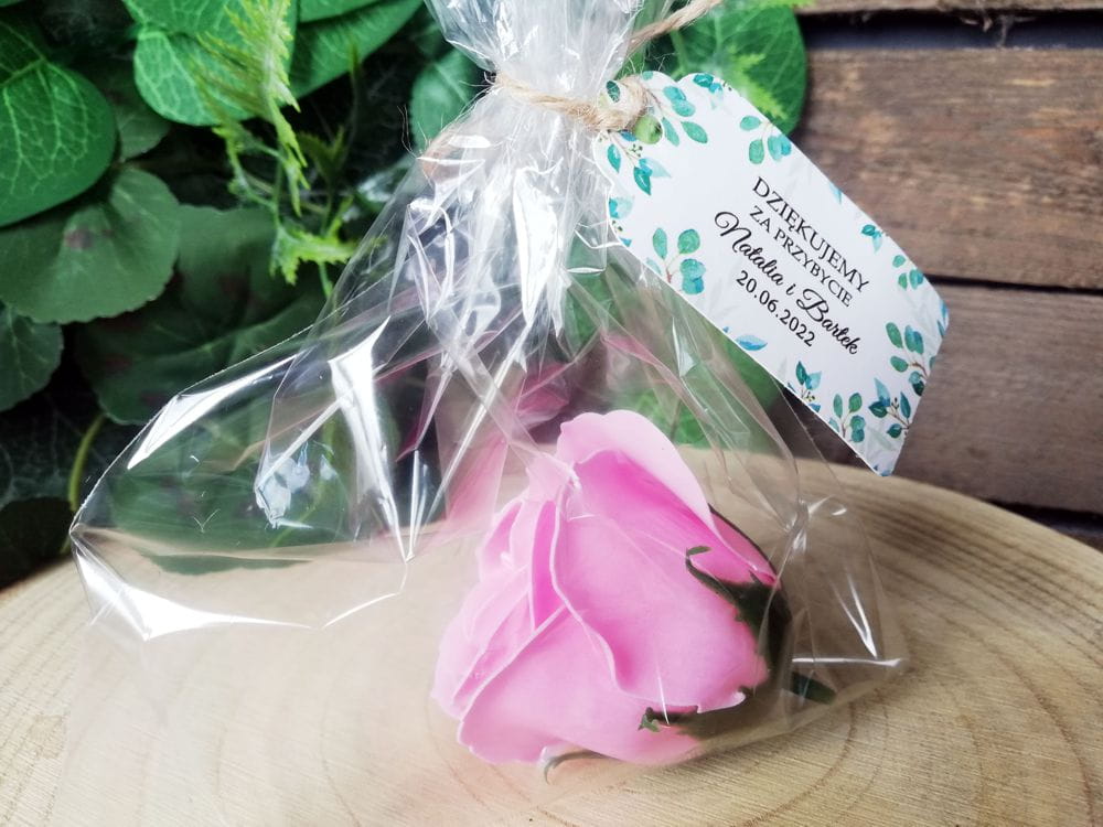 Nasze róże mydlane to oryginalny prezent, upominek dla gości weselnych. Oprócz róży mydlanej w zestawie znajduje się personalizowana zawieszka oraz woreczek celofanowy wraz z dołączonym sznureczkiem jutowym do samodzielnego zawiązania.
