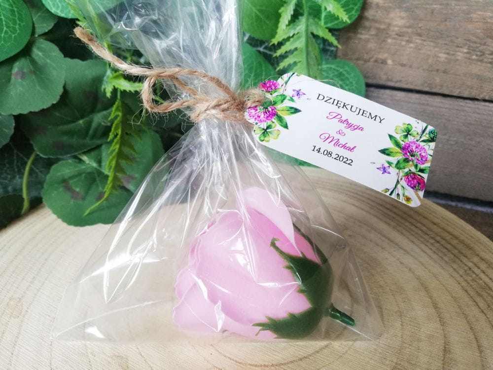 Nasze róże mydlane to oryginalny prezent, upominek dla gości weselnych. Oprócz róży mydlanej w zestawie znajduje się personalizowana zawieszka oraz woreczek celofanowy wraz z dołączonym sznureczkiem jutowym do samodzielnego zawiązania.