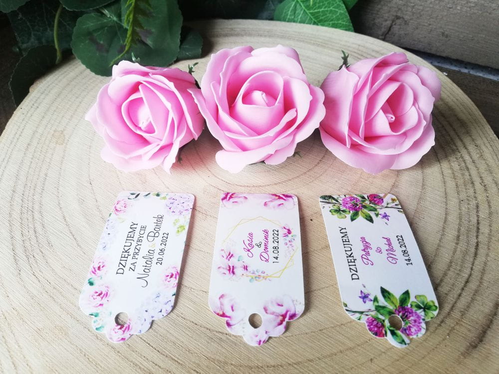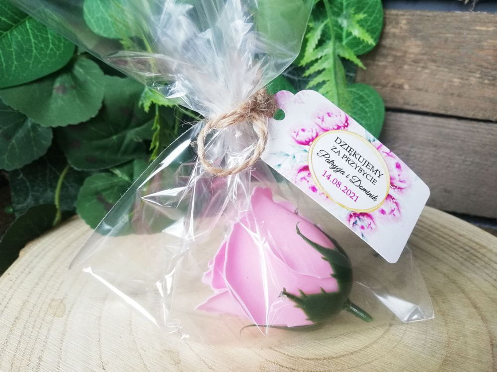 Nasze róże mydlane to oryginalny prezent, upominek dla gości weselnych. Oprócz róży mydlanej w zestawie znajduje się personalizowana zawieszka oraz woreczek celofanowy wraz z dołączonym sznureczkiem jutowym do samodzielnego zawiązania.