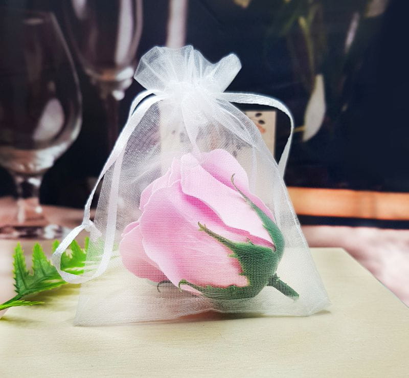 Nasz prezent to połączenie praktyczności z elegancją czyli mydlana róża w woreczku z organzy z personalizowaną zawieszką.