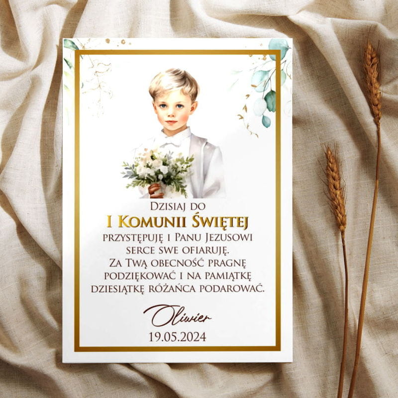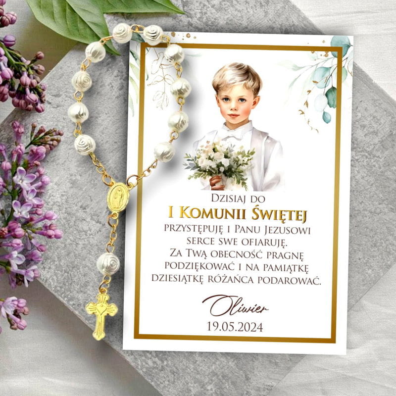Różaniec z karteczką Podziękowanie dla gości od chłopca na I Komunię