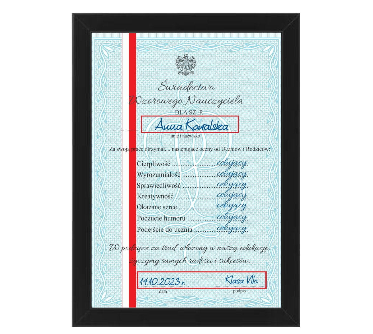 Świadectwo dla Nauczyciela w ramce, upominek dla Nauczyciela Wychowawcy od uczniów