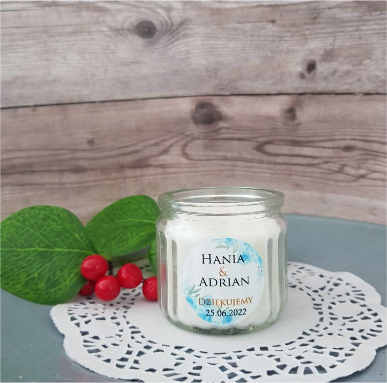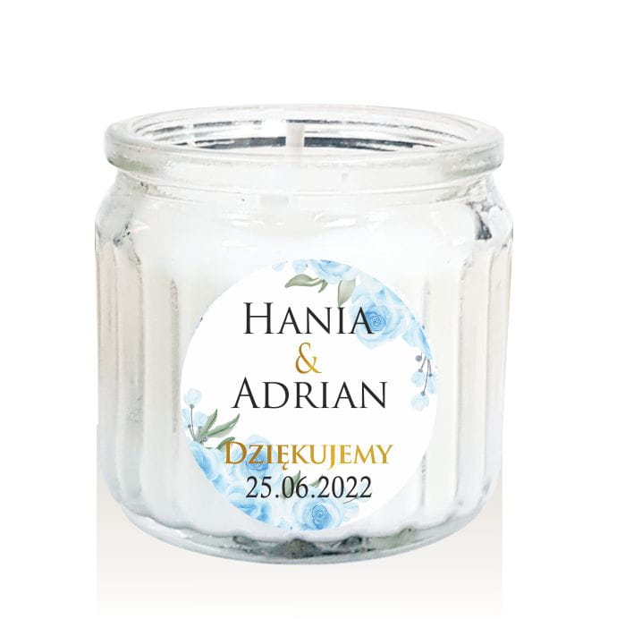 Świeczka z personalizowaną naklejką - Niebieskie kwiaty