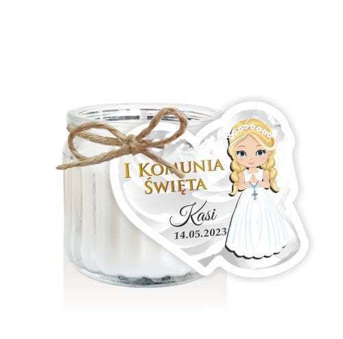 Świeczka zapachowa z zawieszką - podziękowanie dla gości na Komunię, Dziewczynka w sukience