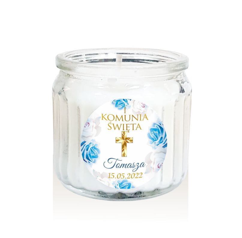 Świeczka zapachowa ze złotym krzyżem, podziękowanie dla gości na Komunię