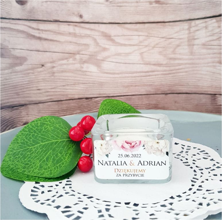 Szklany świecznik z personalizowaną naklejką - Kwiatki piwonie