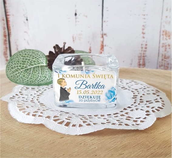 Zestaw 5 szt. Szklany świecznik z naklejką, Chłopiec, Świeczka, Komunia, Podziękowanie dla gości LAM_1005