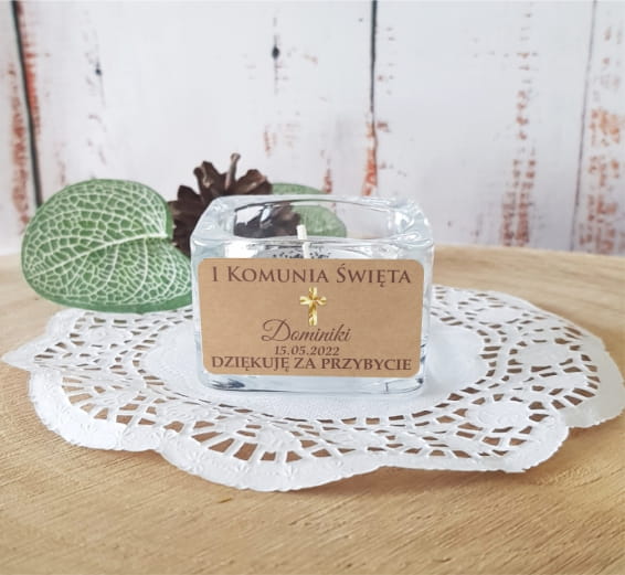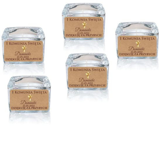 Zestaw 5 szt. Szklany świecznik z naklejką, Eko, Kraft , Świeczka, Komunia, Podziękowanie dla gości LAM_1008