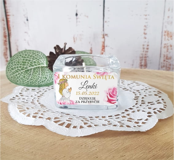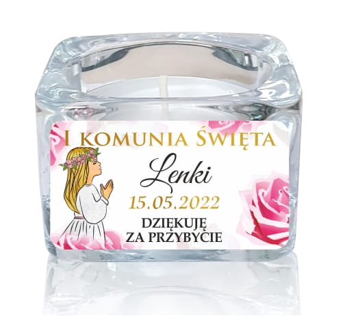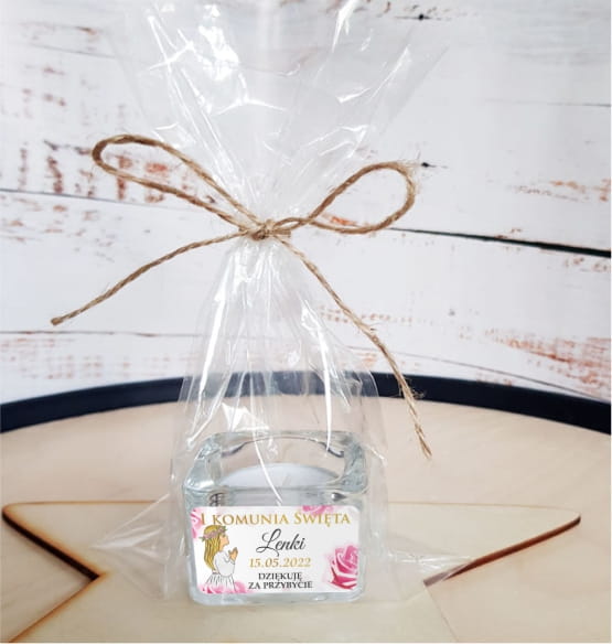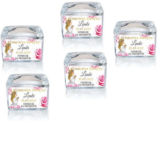 Zestaw 5 szt. Szklany świecznik z naklejką, Świeczka, Komunia, Podziękowanie dla gości LAM_1002