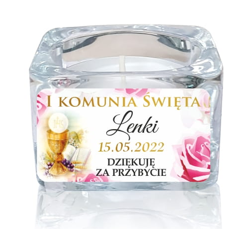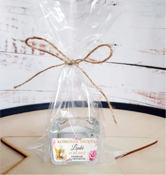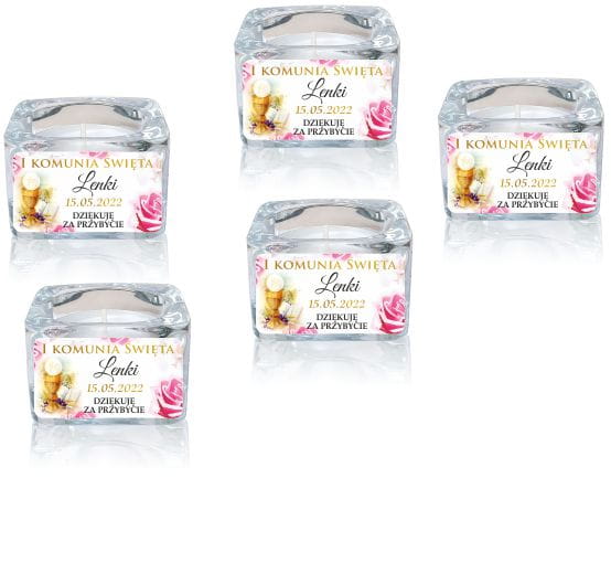 Zestaw 5 szt. Szklany świecznik z naklejką, Świeczka, Komunia, Podziękowanie dla gości LAM_1003